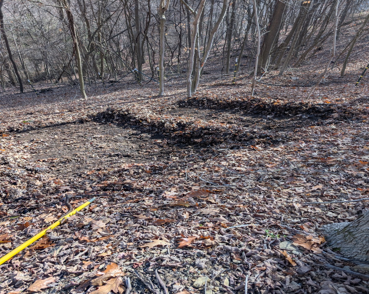 You can then walk on or tamp the soil with something as to lightly pack it down like planting seed in a garden. Then put the leaf litter back on top of the seed & soil you just planted. You can add straw as mulch before the leaves if you need extra mulch. I recommend at least 1 – 2 inches of total mulch, straw and leaves together. If possible, get it done before the leaves come down in the fall giving the area an extra coating of mulch. Also try and plant a day or two before it is scheduled to rain enough to soak but not drench the area.